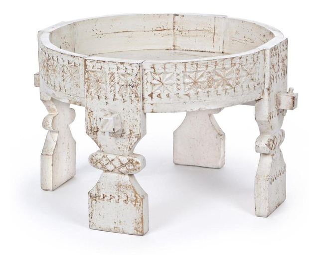 Wykonany z drewna mango z rzeźbionymi zdobieniami. Drewno jest woskowane, aby nadać mu postarzany wygląd. Wymiary: Średnica 50 cm x Wysokość 35 cm. Kolor: Postarzana biel. Ten wyrafinowany i elegancki stolik kawowy oferuje oryginalny design. To wysokiej jakości mebel, idealny do dodania stylu każdemu pomieszczeniu w Twoim nowoczesnym domu, z wielką dbałością o szczegóły!