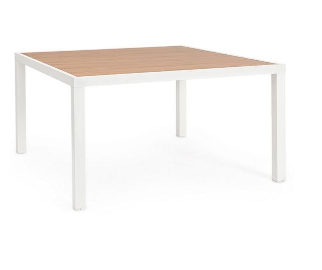 Materiał konstrukcji: Aluminium z powłoką elektrostatyczną. Materiał listew blatu: Aluminium z wyglądem drewna. Materiał elementów montażowych: Stal nierdzewna. Nogi wymagają montażu. Wymiary: Długość 136 cm x Szerokość 136 cm x Wysokość 75 cm. Kolor ramy nóg: Biały. Kolor listew blatu: Brązowy.