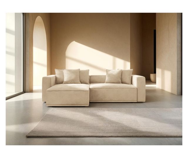 Komfort i styl łączą się w sofie narożnej Mazzini. Ta elegancka sofa narożna, tapicerowana jasnobeżową tkaniną aksamitną Vogue, wniesie odrobinę luksusu do Twojego salonu. Dzięki funkcji spania zapewnia praktyczność i wszechstronność, idealna dla gości lub relaksu. Lewy narożnik dodaje funkcjonalności i idealnie pasuje do różnych przestrzeni.